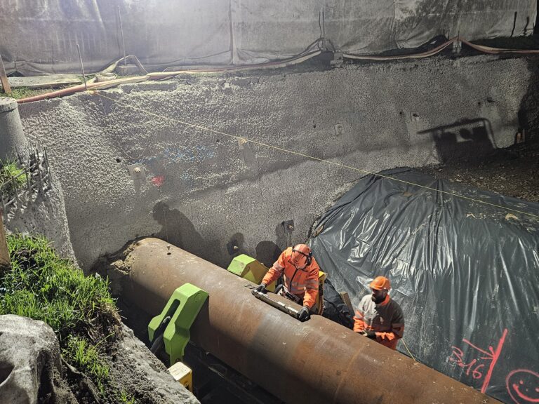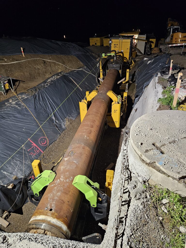 In der Einbaunacht während der Bohrung haben wir die Überwachungspunkte in der Umgebung der Pressbohrung vermehrt gemessen. Dies, um sicherzustellen, dass sich durch die Baumassnahme keine direkten Verformungen auf das Gleis oder die Böschungen auswirken. Während rund 4 Stunden wurde lautstark der Zielgrube entgegengepresst. Die Bohrarbeiten wurden erfolgreich in einer Nachtschicht abgeschlossen, dabei haben wir leichte Verformungen festgestellt.