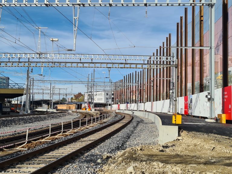 Seit Beginn der Baustelle gilt es tangierende Arbeiten, welche den Bahnhofumbau betreffen, zu berücksichtigen und ein Optimum zu erzielen. Ein Beispiel dafür ist die Überwachung vom Gleis, welches unmittelbar neben der Baugrube liegt.