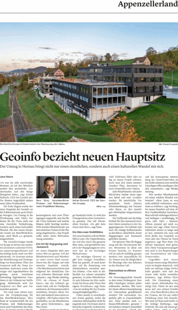 Dass die Gestaltung der neuen Arbeitswelt bewusst im Sinne eines offenen, modernen Bürokonzepts erfolgte, hat auch die Appenzeller Zeitung beeindruckt. helle Räume, flexible Arbeitsplätze, Begegnungszonen und Rückzugsmöglichkeiten prägen die neue Büroinfrastruktur. Mitarbeitende wurden früh in den Prozess einbezogen und konnten mitgestalten, wie die zukünftige Zusammenarbeit aussehen soll. So entstand ein Arbeitsort, der die Bedürfnisse der Teams abholt und gleichzeitig die strategische Ausrichtung unterstützt.